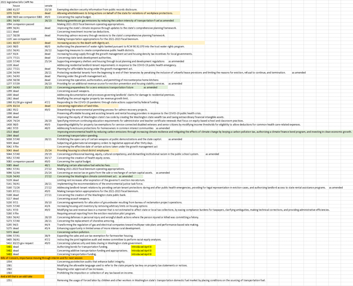 1091 Reducing greenhouse gas emissions by reducing the carbon intensity of transportation fuel. This is a loss, but not entirely, your calls to your legislators can still influence this bill! CAPR opposed this bill which is called a “low carbon fuel standard” but is actually a road map to authorize the Washington State Department of Ecology to create rules (WACs) related to the carbon intensity of fuels, compliance obligations related to same, establish a credit system which will generate credits and deficits related to compliance obligations, and essentially creating a credit banking system. Details of the bill can be read at this link for the bill as passed the legislature. Of note, even if Ecology creates rules, the rules will not be able to be implemented because this section of 1091 did not come to pass at this present date, nor by session close: “ "additive transportation revenue act" means an act enacted after April 1, 2021, in which the state fuel tax under RCW 82.38.030 is increased by an additional and cumulative tax rate of at least five cents per gallon of fuel.” Link to bill history