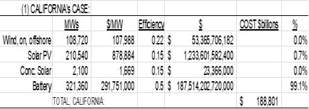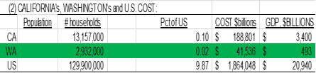 Table (2) are costs for Washington and U.S. The adjustment to determine cost is based on number of households in each state. Washington has just 22% of California's households. The cost for Washington's renewable is $41.5 trillion (green highlighting), an amount 84 times larger than the state's gross domestic product.