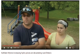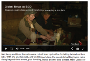 Newswatch[xliii] (Bancroft, Ont.) reports electricity prices jumped 16% in just one year (Aug 2015-Aug 2016) with residents reaching the breaking point. Ian Seaborn was disconnected but obtained a generator from neighbors says even with generator heating now, budget billing and ditching TVs and computers I couldn't keep up and right now we are considering moving in with parents. Resident Jessup and wife says we have to decide between heating the house and feeding the kids. Utility bills jumped to $600 a month with HydroOne installing a load limiter made matters even worse so we could not cook. I'd rather feed my kids but I am behind on my HydroOne bill. Bill Kilpatrick, Bancroft Councilor says the electricity situation has hit hard forcing choices among necessities and half the utility bills are delivery costs (global adjust surcharges) with costs doubling in the winter time which is more than my mortgage payment. Social worker Marcia Depotier was forced to sell her house when level billing increased to $798 and another 60,000 customers had to be disconnected she heard.