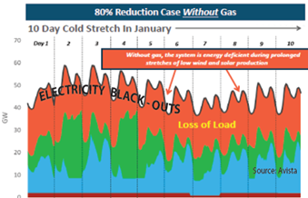 4.6 Where's the Electricity? Experts Promise Blackouts Coming. A major local utility expresses concern for the electricity supply they must provide by the Washington CETA law, which cannot happen. It projects "electricity blackouts" will be common-place in our winter months for any usual 10 day stretch in December, January or February when 50% of customers will go without electricity. The reason: With traditional energy systems shut, renewables cannot provide it to fill the gap. The renewables proposed and hydroelectric dams combined fail to provide more than one-half of needed supply of electricity. Expert power planners illustrate below the 80% greenhouse gas-reduction case (without natural gas) invites widespread winter cold blackouts because electricity cannot be provided, but at the 100% GHG-free case CETA mandates when conditions worsens dramatically, demand explodes higher, supply dwindles to pose life-threatening conditions. This will begin after 2030 when the CETA law comes into full effect.