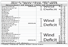 4.7 Bonneville Proves Wind Cannot Perform. Wind is a NO-SHOW in time of need. The power generation record of wind turbines available from the Bonneville Power Administration for its 46 WA-OR a system proves that wind, no matter the number of turbines cannot provide electricity when the wind does not turn the blades. The table shows the number of days per month over a period of 776 days when a low or no-wind condition (defined as a deficit) exists, when BPA's wind turbine output falls below 5% of capacity. Over the 776-day October 2013 to March 2014 period the deficit extends for 81 days or 45% of the winter. The subsequent Oct. 2014 to Feb. 2015 deficit period lasts 88.8 days. Of great concern: 3.8 million BPA customers are promised electricity yet 3.6 million did not receive electricity. The period without generation lasts 10.2 days to 20.3 days for any month.