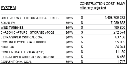 4.12 Raw Materials Needs for Renewable Systems; Comparing Performances[lvii] In 2017 the World Bank estimated the raw material needs (minerals, metals, non-metals, manufactured products) to build renewable energy systems. The following lists the material needs which equates to the capital cost to build each. The capability expressed material cost adjusted for efficiency ($US per megawatt (MW)) using the current prices[lviii] of raw materials. The cost in materials to construct a conventional coal plant, for comparison is $1,717 per MW. It is clear from World Bank data that all renewable systems are at least 10 times more expensive to build than conventional coal. In the case of the top three most costly systems, grid storage, solar PV and wind turbines, their cost ranges from 286 times (wind) to 4,656 times (solar PV) to 849,000 times (grid storage using lithium batteries) more costly than conventional coal plants. One must not forget that national media advertises wind and solar as "free" energy, but in reality it is much different. Most likely grid storage, solar PV, wind turbines and capture of carbon dioxide will never be built on large scale due to their unaffordable high cost in comparison to conventional electrical power systems.