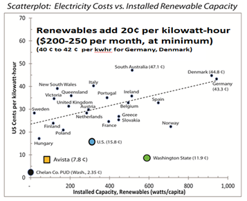 As competitors disappear the rise in cost of electricity can be directly traced to the percentage unbridled growth in costs of renewables that electrify a region (see Ontario). The chart assembled by the author shows that for each one kilowatt of renewable energy installed per capita that the electricity charged by the utility rises by up to 20 cents per kilowatt-hour. Accordingly a 20¢ rise adds $200 to $250 per month to electric bills, at minimum, with other locations experiencing much larger rate increases. Highest prices are seen in Australia and Europe with very high charges are in Denmark (44.8¢/kwh), Germany (43.3¢/kwh) South Australia (49.1c.kwh) and Italy (40.3¢/kwh). A breakdown of details of billing in Germany shows the generation cost and surcharge fees. In the last decade Germany's electric generation charges have fallen 1.5 cents per kwhr while surcharge additions of 36 cents have accumulated since Energiewende began.